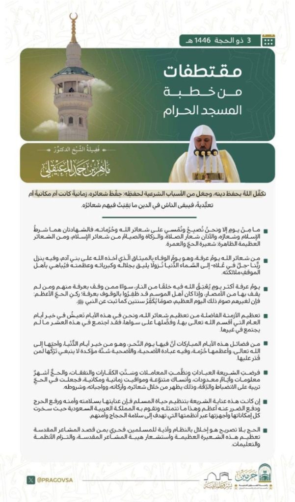 كما تناول الشيخ ماهر المعيقلي جهود المملكة في توفير الأمن والسلامة للحجاج، مؤكداً على أن الحج بدون تصريح يعد خرقاً للنظام. ودعا الجميع لتعظيم شعائر الله، والابتعاد عن الجدال والخصام، مع ضرورة الالتزام بالأنظمة والتعليمات المتبعة.