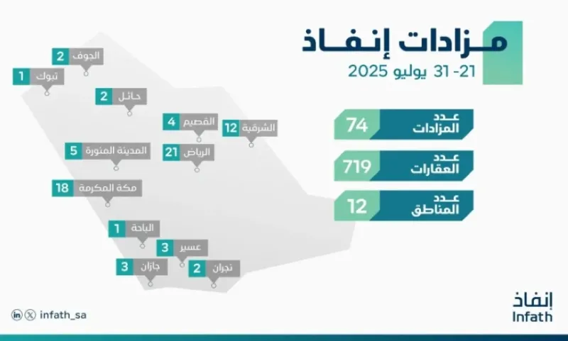 قام مركز الإسناد والتصفية “إنفاذ” بتنظيم سلسلة من المزادات العلنية التي ستغطي إثني عشر منطقة بالمملكة، حيث تتضمن هذه المزادات عرض وتصريف 719 أصلاً. هذه المزادات ستقام في الفترة من 21 إلى 31 يوليو 2025، وتأتي كفرصة هامة للمستثمرين والمشترين.
