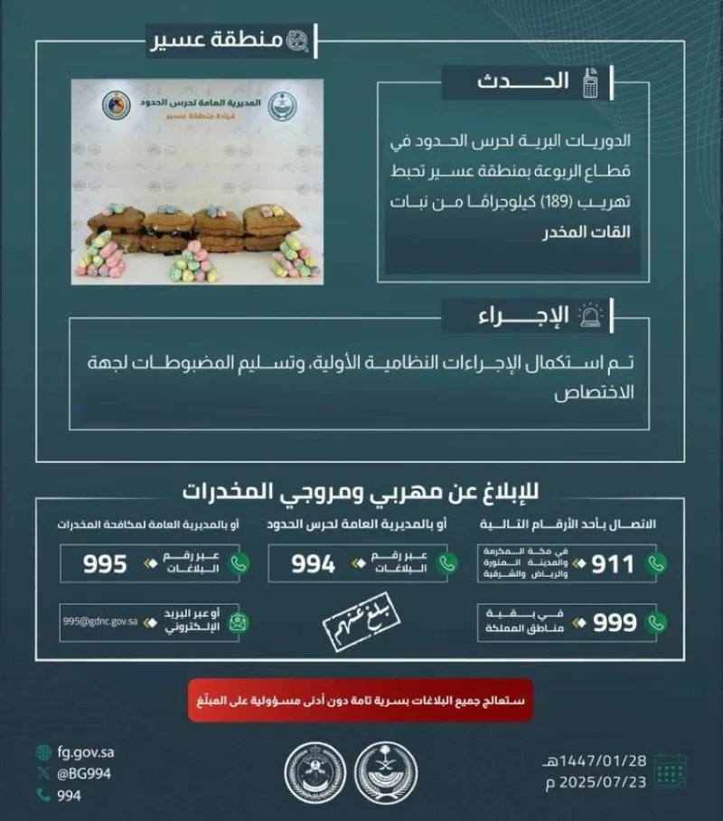 أحبطت الدوريات البرية التابعة لحرس الحدود في منطقة عسير عملية تهريب كبيرة لنبات القات، حيث بلغ وزن المضبوطات 189 كيلوجراماً. الحادثة وقعت في قطاع الربوعة، وتم اتخاذ الإجراءات النظامية اللازمة بعد ضبط المحصول. النقل غير المشروع لهذا النوع من المخدرات قد يمثل تهديداً للأمن المجتمعي، مما استدعى تكثيف جهود الجهات الأمنية.